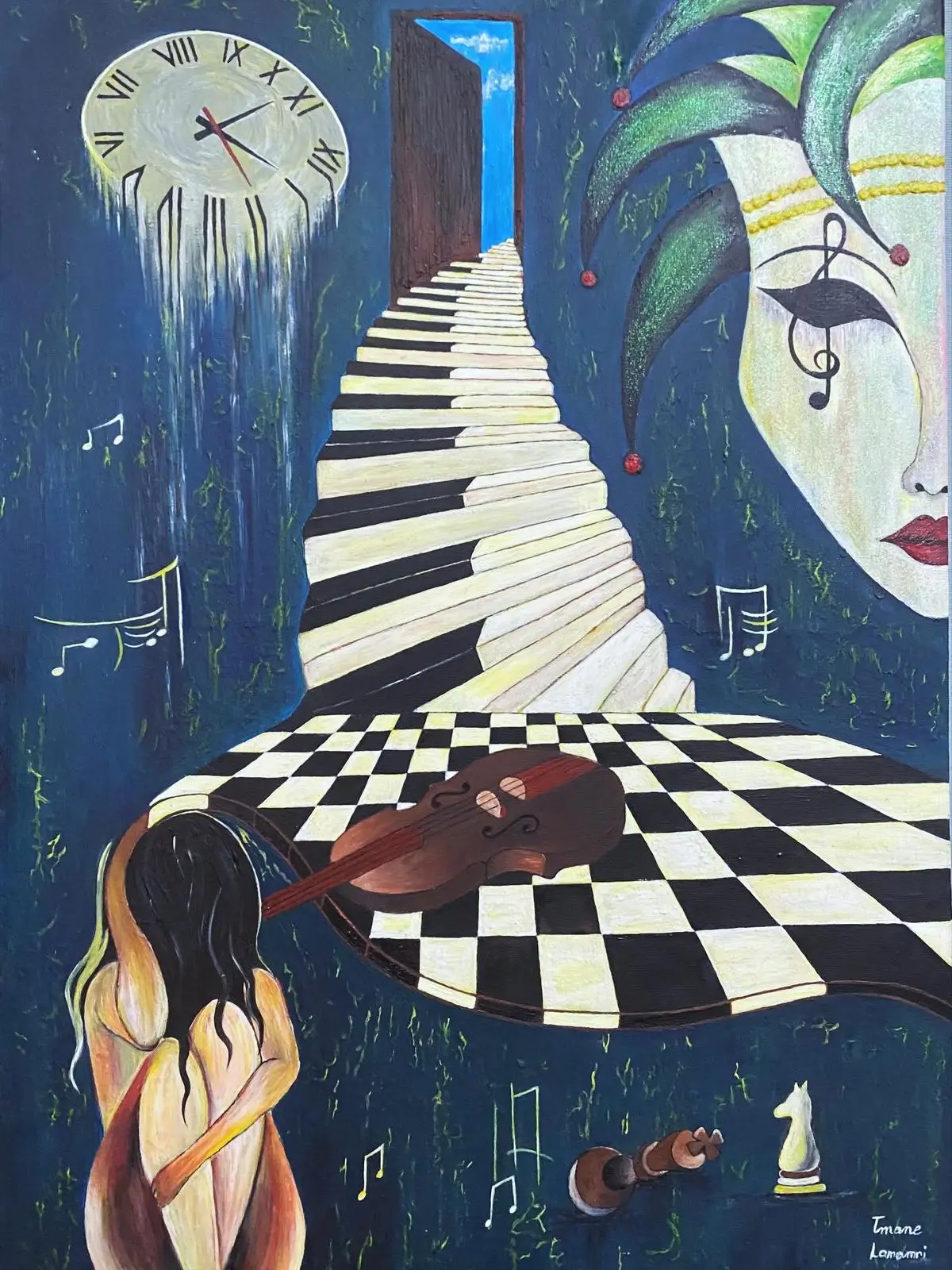 A surreal journey of time, music, and inner transformation. The melting clock shows how moments fade, the piano staircase reflects growth, and the open door symbolizes freedom. The masked face reveals hidden identity, while the abandoned violin and chess pieces represent memories, choices, and the fragile beauty of becoming yourself.