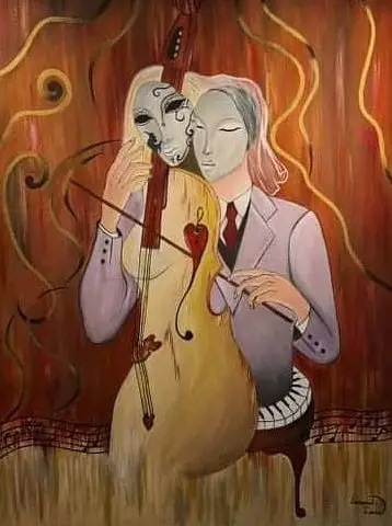 This painting explores attachment the way two people can merge emotionally until they become one shape, one breath, one melody. The woman becomes the instrument and the man becomes the one who holds, plays, and shapes her rhythm. Their masks show how attachment often hides true identity, and the heart suspended between them represents a love that is intense, beautiful, but dependent on a connection where losing the other means losing a part of yourself.