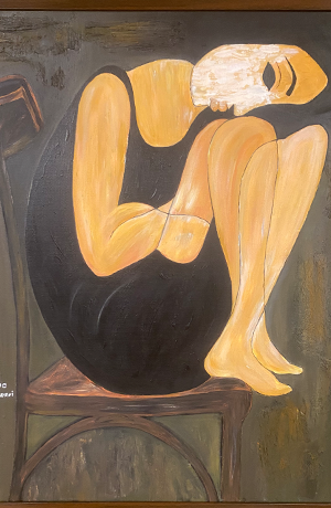This painting captures a moment of emotional retreat a woman curled into herself, protecting the last soft part of her soul. Her body forms an oval, like an eggshell, symbolizing vulnerability, rebirth, and the instinct to hide when life becomes too heavy. The muted gold and earthy tones reflect exhaustion but also quiet strength. Her face, half-masked and turned inward, suggests someone who has stopped showing her truth to the world, keeping her pain private. The empty chair behind her represents absence of comfort, of someone who should have been there, or of a part of herself she hasn’t yet reclaimed. It is the portrait of a woman who is tired, fragile, and protecting herself but still whole, still holding on.