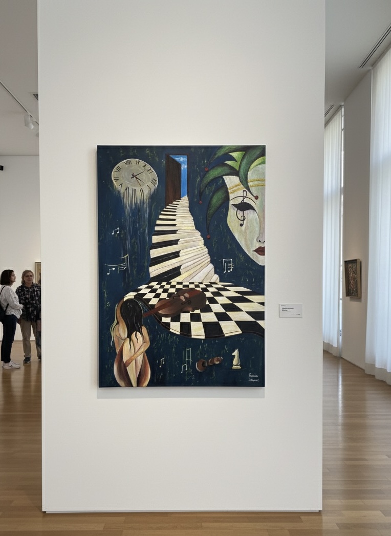 A surreal journey of time, music, and inner transformation. The melting clock shows how moments fade, the piano staircase reflects growth, and the open door symbolizes freedom. The masked face reveals hidden identity, while the abandoned violin and chess pieces represent memories, choices, and the fragile beauty of becoming yourself.