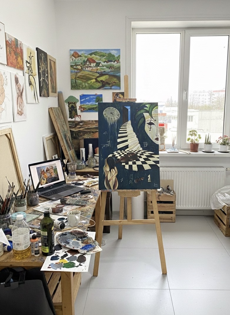 My canvases often carry symbols, doors, masks, silhouettes, storms, and horizons stories whispered in colour rather than words. I am fascinated by contrasts: softness and rebellion, vulnerability and strength, chaos and harmony. Every piece I create is a dialogue between what I lived and what I dreamed, between who I was and who I am still becoming.