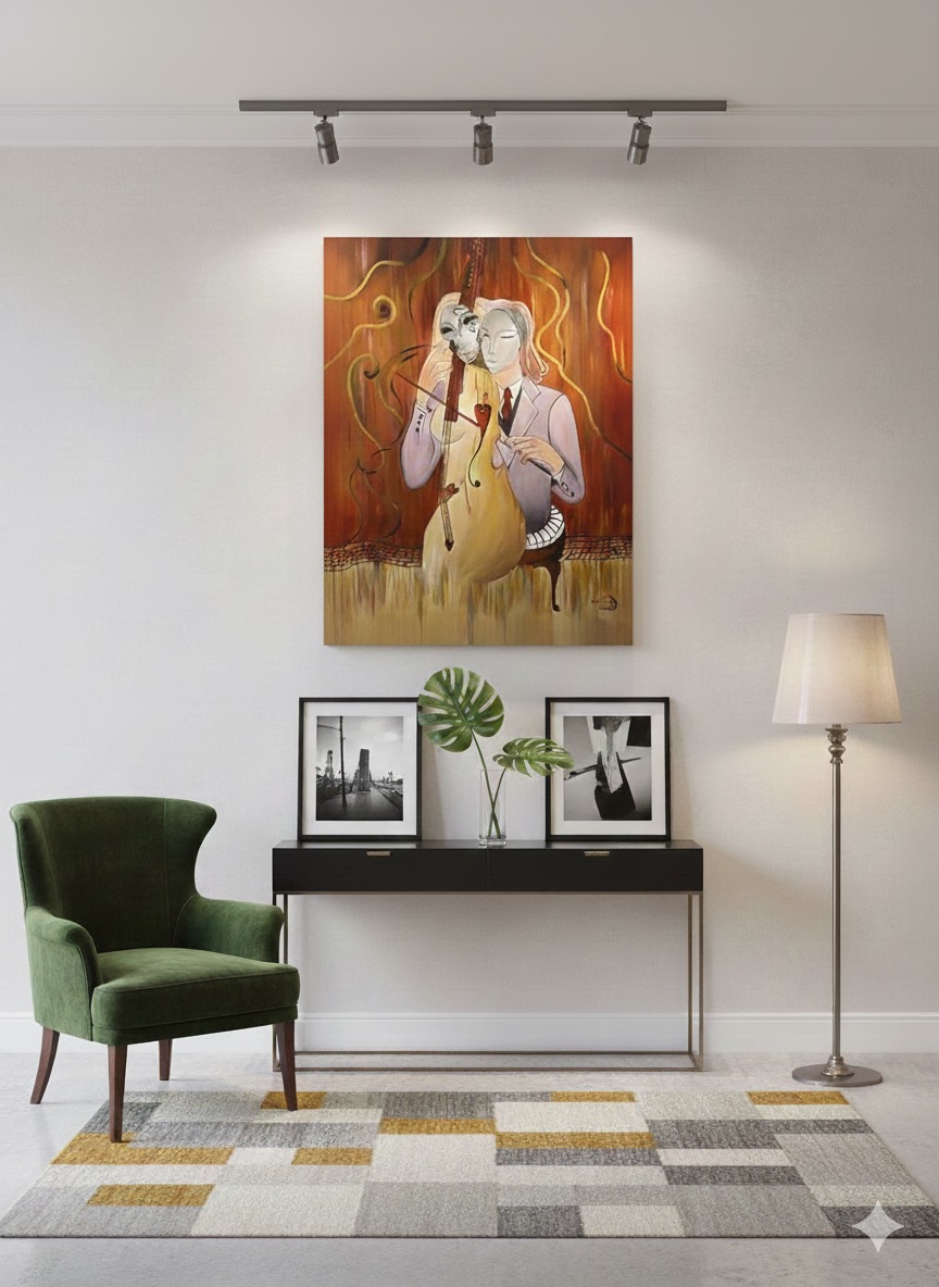 This painting explores attachment the way two people can merge emotionally until they become one shape, one breath, one melody. The woman becomes the instrument and the man becomes the one who holds, plays, and shapes her rhythm. Their masks show how attachment often hides true identity, and the heart suspended between them represents a love that is intense, beautiful, but dependent on a connection where losing the other means losing a part of yourself.