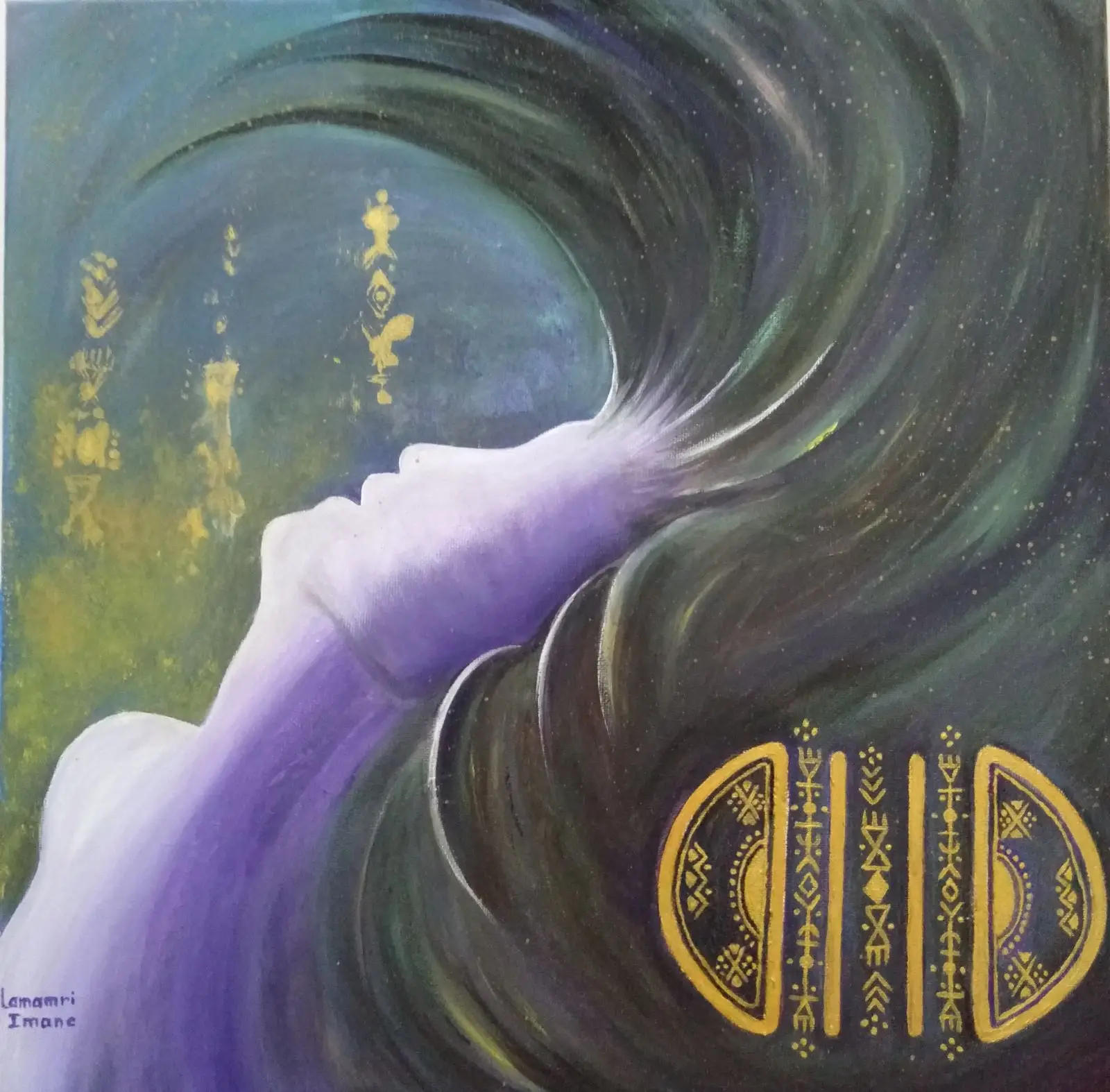 This painting shows a woman rising into a moment of inner awakening, her face lifted toward clarity. The soft blue around her reflects calm, healing, and emotional release, while the gold symbolizes strength and sacred energy. Above her, the Amazigh symbols glow like a protective crown: the ⵣ represents freedom and identity, the diamonds symbolize the feminine spirit and the protective eye, and the curved shapes reflect life cycles and spiritual doors. Together, these symbols connect the woman to her Amazigh roots, showing that her transformation is guided, protected, and empowered by the strength of her ancestors.