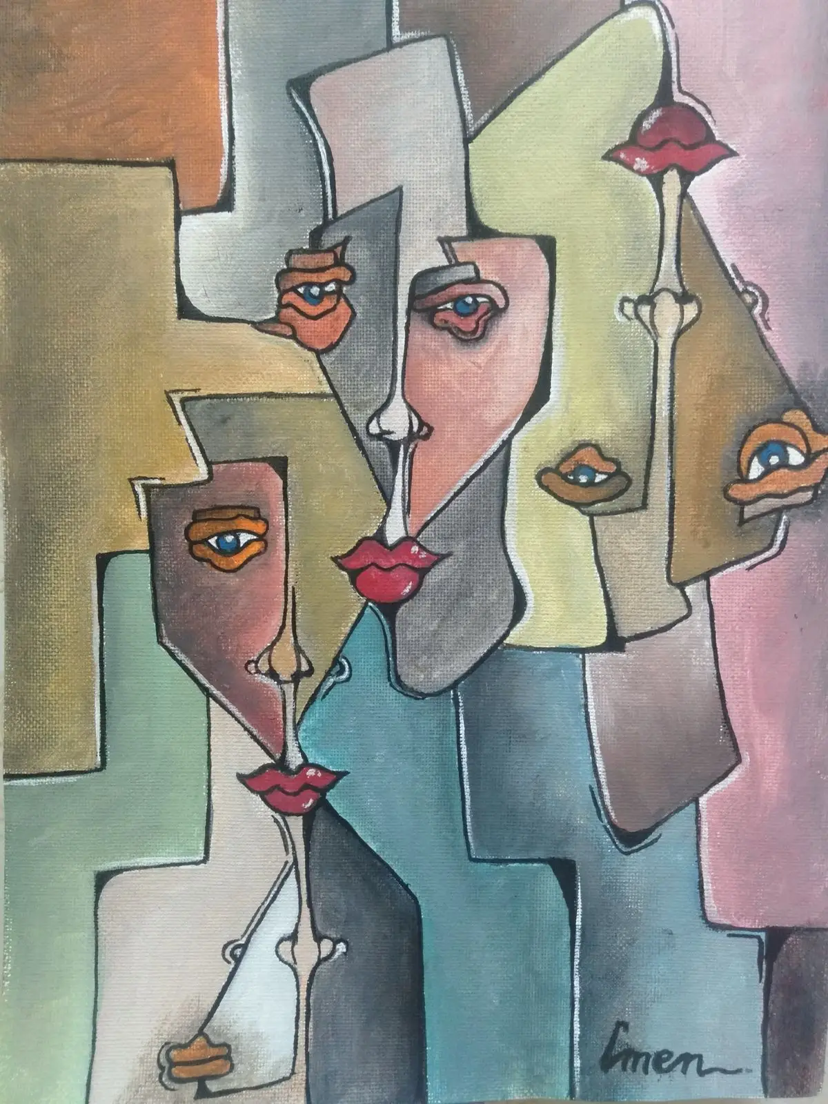 This painting shows the complexity of human identity and relationships. The fragmented faces symbolise how we carry many versions of ourselves the parts we show, the parts we hide, and the parts others think they see. The multiple eyes represent perception, judgment, and emotional awareness, while the scattered lips suggest unspoken thoughts, secrets, and the voices we silence. The colours warm earth tones mixed with cooler blues reflect inner conflict: connection and distance, truth and confusion, unity and fragmentation.