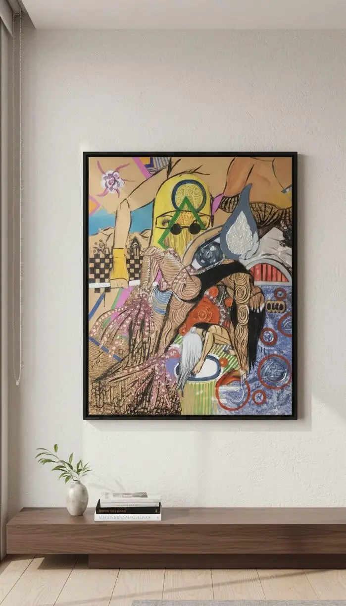 She stands at the heart of the storm a woman stitched together by passion, dreams, and the weight of a loud society. Around her, colours collide, bodies fragment, and expectations press against her skin. Yet in the centre, a quiet symbol glows like a hidden pulse the last place where she keeps herself whole. This painting is her breath against the world, her silent resistance, her beauty rising through the pressure.
